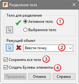 Если вы выбираете опцию Разделить, не выбрав подходящего режущего объекта или активного тела, открывается диалог Разделение тела: