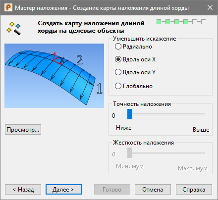 Просмотр - нажмите эту кнопку, чтобы открыть карту наложения на целевой поверхности или теле с целью визуализауции результатов наложения. Наложение при просмотре имеет вид шахматной доски, на которой хорошо видны любые искажения.