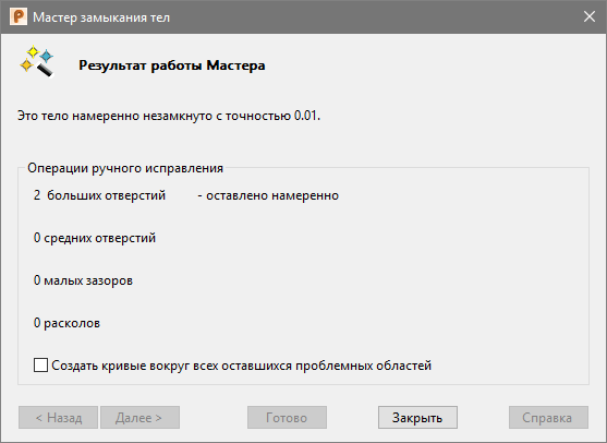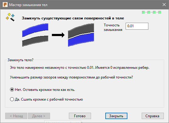 При нажатии ОК в предупреждающем диалоге, вы возвращаетесь к мастеру для изменения Точности замыкания. Нажатие кнопки Готово либо открывает предупреждающее сообщение (если процесс восстановления снова не удался при заданной точности), либо открывает страницу Результат работы Мастера замыкания.