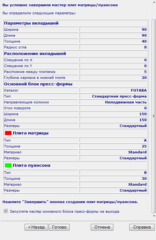 Готово - создает плиты матрицы и пуансона. Плиты создаются в сборе.