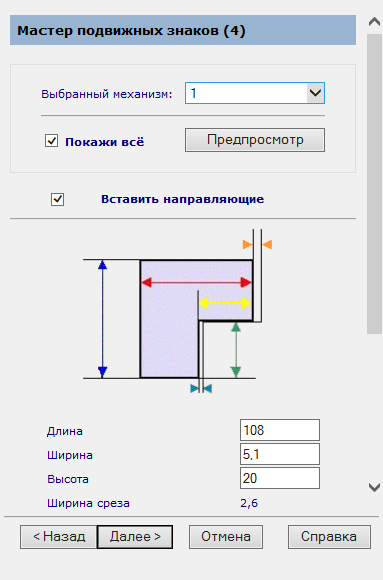На этой странице задаются размеры направляющей ползуна.