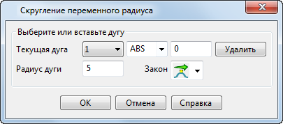 - Закон - отображает изменение радиуса в положении текущей дуги. Чтобы задать правило изменения радиуса скругления выбранной дуги, воспользуйтесь опцией: