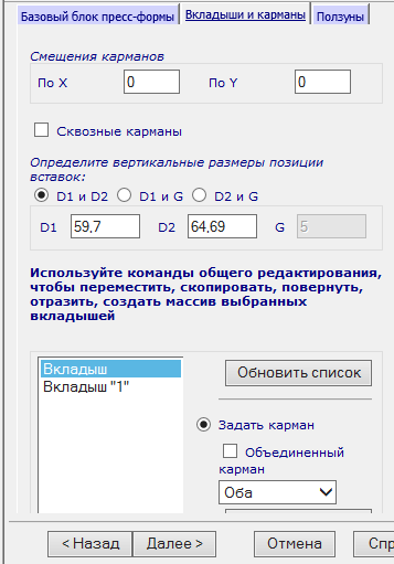 Смещение карманов - смещает положение кармана внутри плит матрицы или пуансона.