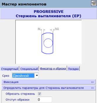 Вкладка Фиксатор и обрезка содержат параметры одиночных или двойных стержней со шпоночными пазами, доступными для гладких, ступенчатых, дисковых стержней выталкивателя и шпилек. Открывшиеся параметры зависят от типа создаваемого компонента.
