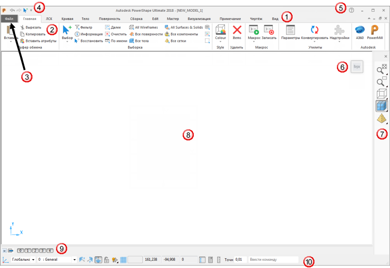 В PowerShape используется интерфейс в стиле Windows, состоящий из ленты со вкладками. Области экрана определены следующим образом: