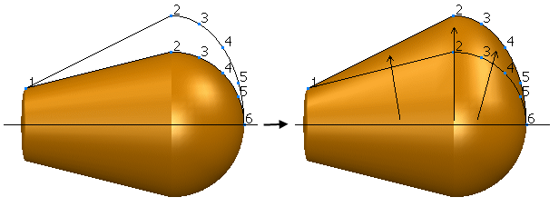 До кривой или Поверхность - точки перемещаются в зависимости от расстояния до соответствующей точки на справочной кривой и от расстояния от ближайшей точки на выбранной ограничивающей кривой или поверхности.