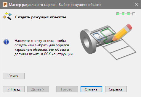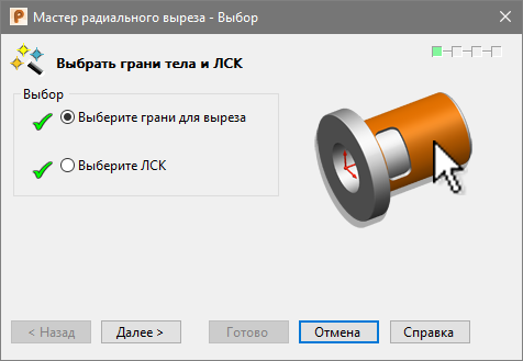 - Выберите созданную ранее ЛСК и цилиндрическую поверхность, в которой нужно сделать вырез, а затем нажмите кнопку Далее.