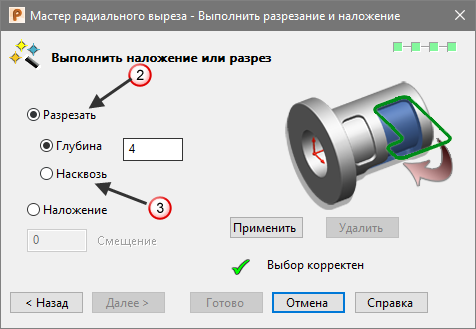 - Нажмите кнопку Далее, чтобы открыть страницу Выполнить наложение или разрез Мастера радиального выреза: