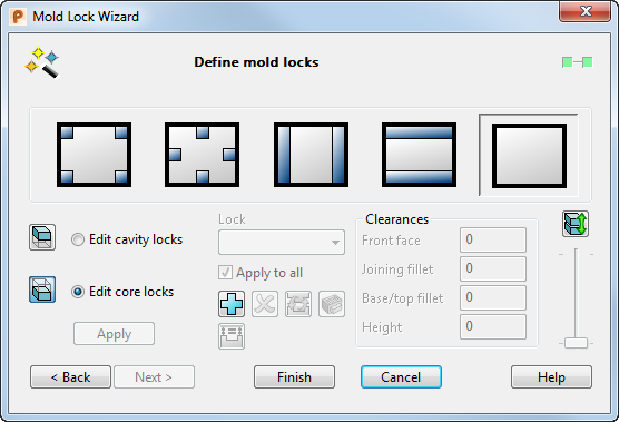 Если Мастер крепления пресс-формы уже использовал эти вкладыши для создания фиксаторов, они автоматически распознаются и добавляются в выпадающий список Фиксатор. Любой фиксатор пресс-формы из выпадающего списка можно отредактировать с помощью опций, доступных на этой странице мастера.