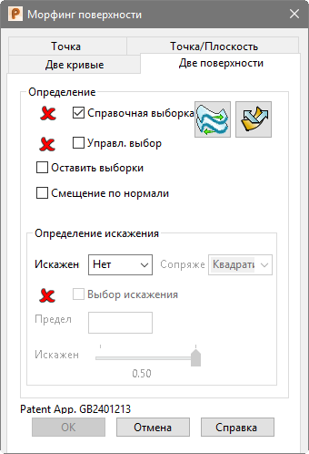 Если опция Смещение по нормали не выбрана, вы можете задать опции Определения искажения. Это опции, которые используются для определения искажения, описанного в разделе Диалог Морфинг поверхности - Две кривые.