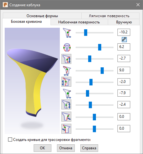 Сопряжение спереди - потяните слайдер, чтобы изменить угол касательных в верхней точке боковой и фронтальной кривых с целью достижения плавного сопряжения со справочной поверхностью.