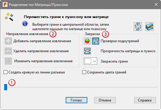 — нажмите эту кнопку, чтобы повторно вычислить линию разъема и классификацию граней. Это может потребоваться, если вы выполняли много изменений в модели или направлении извлечения.