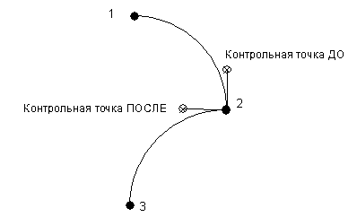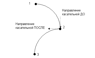 В точке могут существовать два направления касательных: одно - перед точкой, а другое - после точки. На картинке показаны направления касательных до и после точки 2. Обратите внимание, что положение направления касания до точки направлено от контрольной точки, а положение направления касания после точки направлено к контрольной точке.