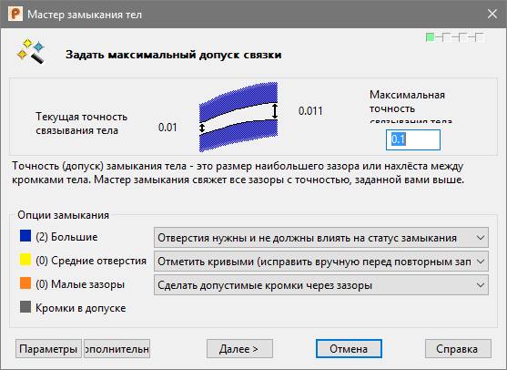 Дополнительно - нажмите эту кнопку для открытия страницы Исправить отверстия в теле, где можно задать значения опций заполнения отверстий.