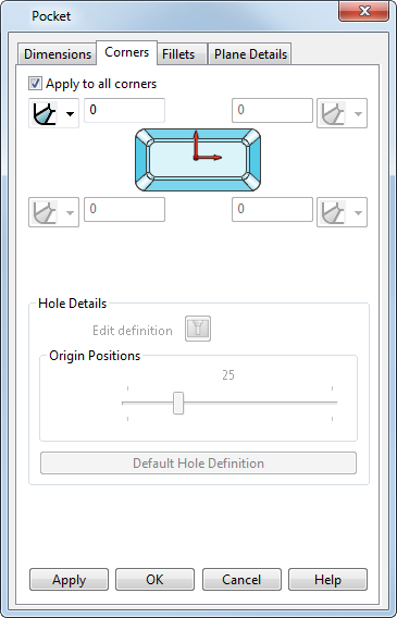 — Создать отверстие в углу. При выборе этой опции раздел диалога Параметры отверстия становится активным, что дает возможность задать размер, тип и положение отверстия. Угловое отверстие можно создать только в кармане.Параметры отверстия - если создаётся несколько угловых отверстий, можно задать их размер и положение, используя данный раздел страницы Углы.