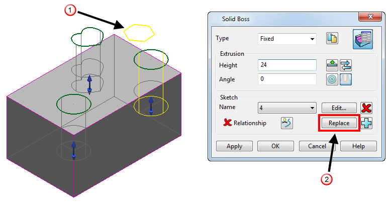 - Нажмите кнопку Применить, чтобы повторно создать бобышку посредством замены кривой. Кривая заменённого тела вытягивания остаётся в модели.
