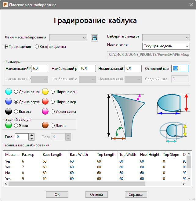 - Коэффициенты, чтобы задать градирование с помощьютаблицы преопределенных масштабных коэффициентов, основанных на Номинальном размере обуви.