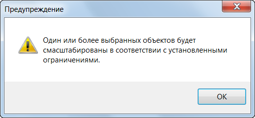 Прим.: Предупреждение, показанное ниже, открывается при исользовании вкладки Правка > панель Трансформация > Масштаб для масштабирования нескольких объектов, если среди них есть объект с ограничителями масштабирования.