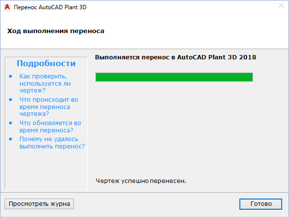 При попытке добавления чертежа, созданного в более ранней версии, в проект, созданный с помощью текущей версии, открывается Мастер переноса чертежа. Будет перенесен только чертеж, который добавляется в проект. При переносе можно создать резервную копию на случай, если в дальнейшем потребуется отредактировать чертеж в более ранней версии. Если отменить перенос чертежа, он вернется в исходное состояние.