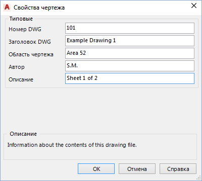 - В поле "Описание" введите описание (например, Проект, к которому принадлежит этот чертеж).