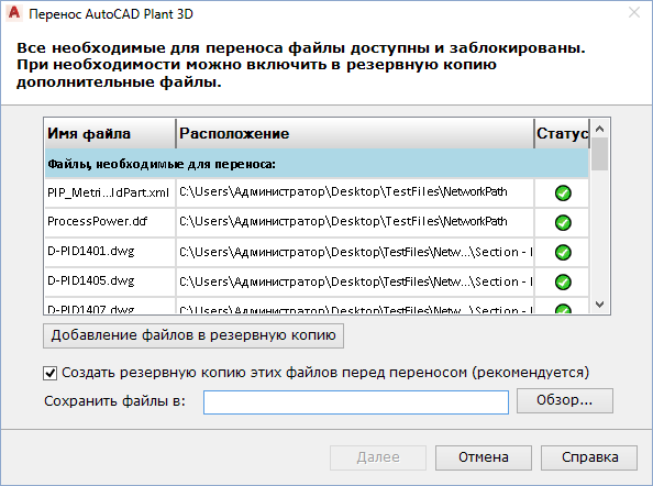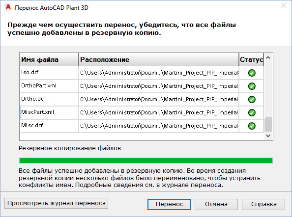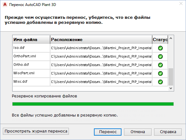 - Нажмите кнопку "Далее". На странице "Резервное копирование при переносе проекта" отображается ход выполнения резервного копирования, а также сообщается об успешном создании резервной копии каждого из файлов.