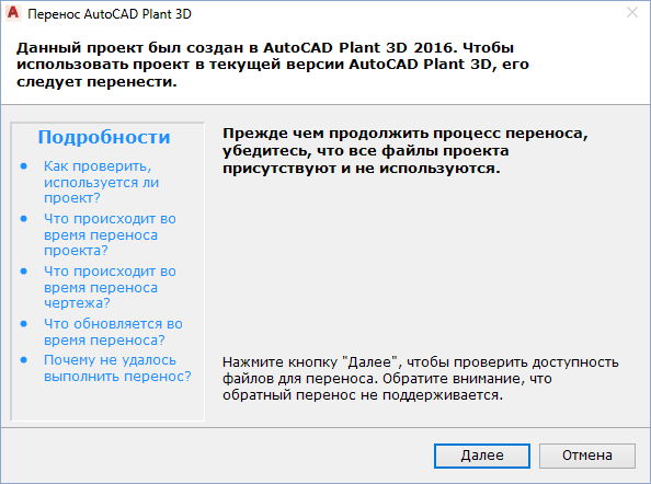 - Убедитесь, что проект и связанные с ним файлы чертежей закрыты. На странице "Запуск переноса проекта" нажмите кнопку "Далее".