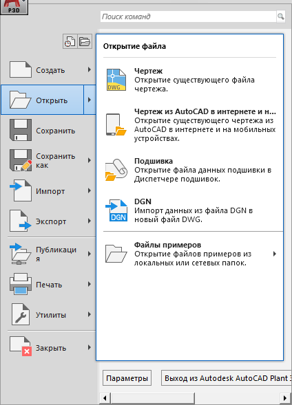 Меню приложения, расположенное в верхнем левом углу окна программы, заменило традиционную структуру меню, возможно, знакомую вам по предыдущим выпускам AutoCAD Plant 3D toolset.
