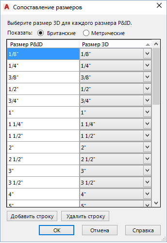 - В столбце "Размер P&ID" выберите размер (например, 3/8 дюйма).