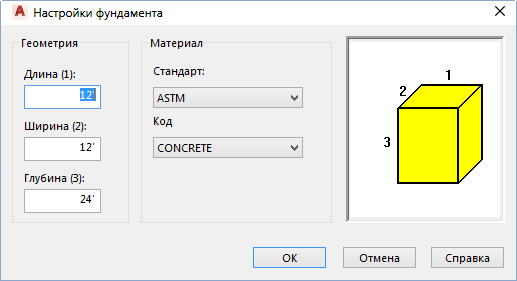 В диалоговом окне "Параметры фундамента" введите значения, которые будут использованы для новых фундаментов. Нажмите кнопку "ОК".