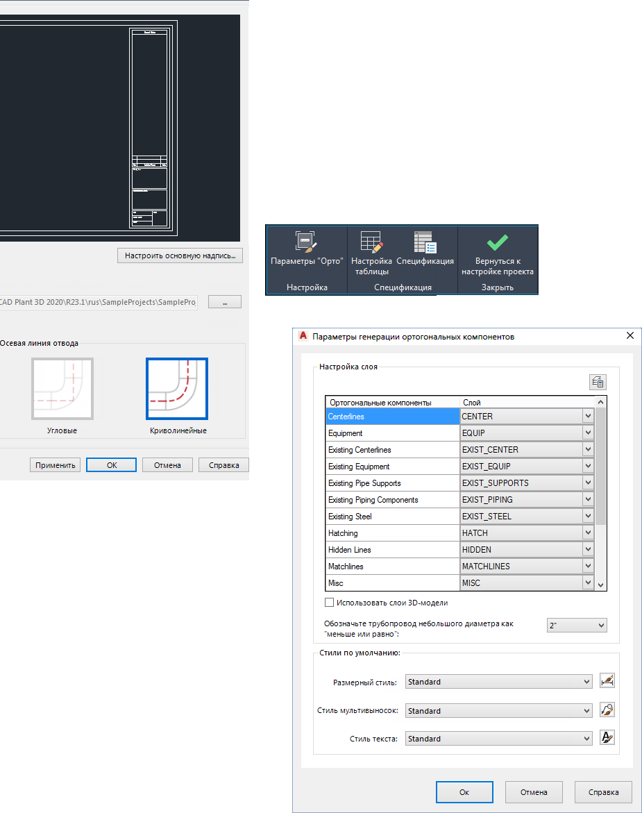 Можно настроить пути к файлам ортогонального шаблона и двумерного чертежа и отображение по умолчанию, например отображение скрытых линий трубопровода и осевых линий отводов. Можно также задать слои для определенных ортогональных компонентов.