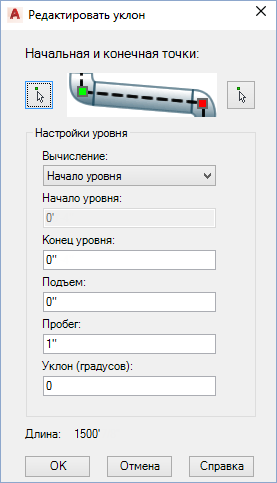 В списке "Вычисление" щелкните "Уклон". Вычисление уклона позволяет задать начальный и конечный уровни. Также с помощью параметров "Начало уровня" и "Конец уровня" можно ввести угол или высоту уклона.