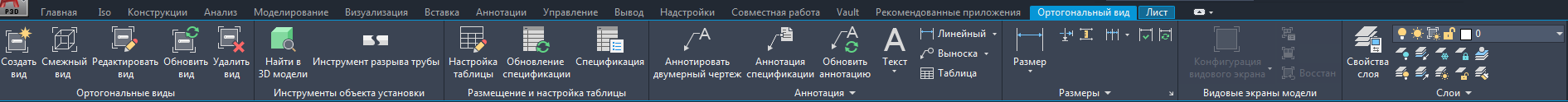 При переходе в специальную ортогональную среду при помощи кнопки "Создать ортогональный вид" на вкладке "Главная" становится доступной контекстная вкладка ленты. Она содержит специальные команды для среды редактирования ортогональных чертежей. После выхода из специальной среды контекстная вкладка закрывается.