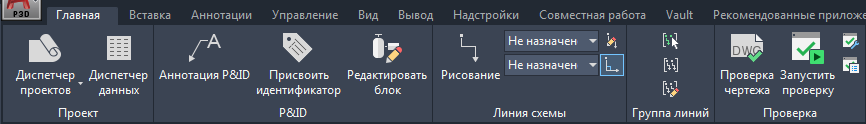 На вкладке "P&ID – главная" отображаются параметры для работы с чертежами P&ID. Данная вкладка содержит следующие панели: