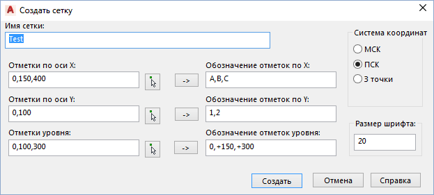 Чтобы задать систему координат для создания сетки, в разделе "Система координат" щелкните "МСК", "ПСК" или "3 точки". При выборе пункта "3 точки" укажите начало координат и направление трех осей сетки.