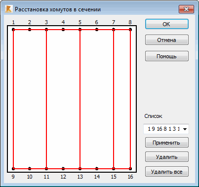 Определение формы и распределения поперечного армирования осуществляется щелчком кнопки мыши по последовательным продольным стержням. Определенные формы представляют собой замкнутые формы хомутов. Символом штифта или хомута является прямой сегмент, соединяющий два продольных стержня. Последовательное определения формы можно закончить, нажав на кнопку Применить.