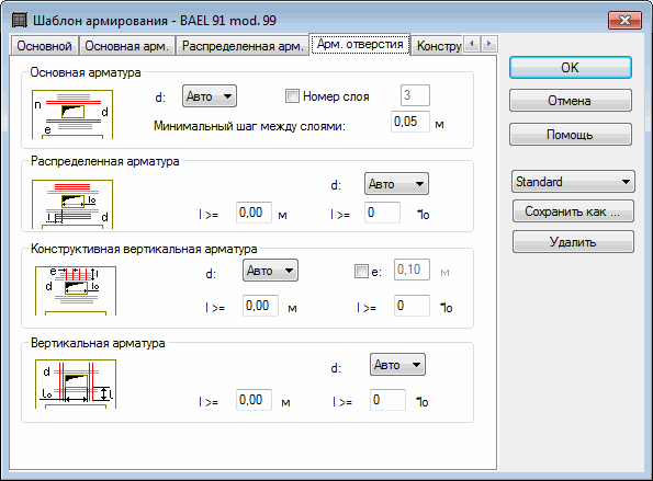 Если открыто диалоговое окно Шаблон армирования и выбрана вкладка "Армирование отверстий", то есть возможность определить способ установки арматуры отверстий.