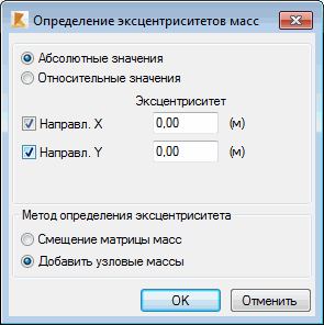 Показанное ниже диалоговое окно используется для учета в сейсмических расчетах перемещения массы при наличии эксцентриситета. Диалоговое окно доступно при нажатии на кнопку Определение эксцентриситетов в диалоговом окне Параметры модального расчета.