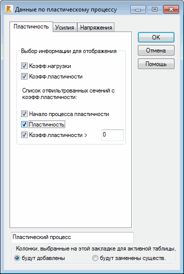 При переходе на вкладку "Пластичность" в диалоговом окне Таблица колонн появляется следующее диалоговое окно.