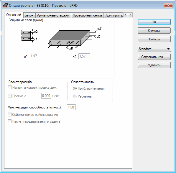 После открытия диалогового окна Опции расчета для железобетонных конструкций и выбора вкладки "Основная", появится на экране нижеприведенное окно.