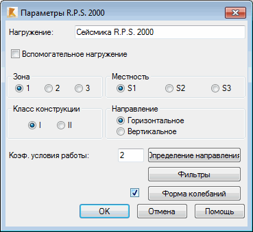 Параметры сейсмического расчета конструкции зависят от выбора сейсмических норм, по которым производится расчет влияния сейсмических нагрузок на конструкцию. После выбора марокканских сейсмических норм RPS 2000 в диалоговом окне Новый вариант нагружения или нажатия на кнопку Параметры в диалоговом окне Тип расчета на экране появляется следующее диалоговое окно.
