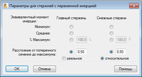 В этом диалоговом окне определяются параметры переменного момента инерции сечения для основного и присоединенных стержней. Переменный момент инерции, как для главного стержня, так и для присоединенных стержней заменяется постоянным по длине Эквивалентным моментом инерции, который используется при вычислении коэффициента продольного изгиба стержня. Эквивалентный момент можно определить одним из трех способов: как Минимум, как Среднее значение или как процент от значения Максимума момента инерции.
