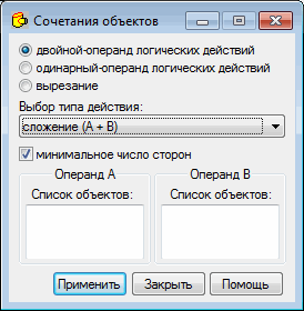 Опции, включенные в вышеуказанное диалоговое окно, позволяют сочетать ранее определенные двумерные объекты (поверхность трубы, поверхность призмы, арка и т. д.) и объемные объекты в комплексные объекты. Для двумерных объектов операции выполняются на поверхностях в отличие от объемных объектов.