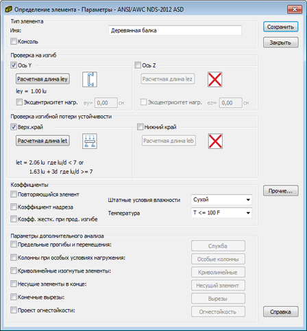 В этом диалоговом окне можно определить параметры норм для элемента в соответствии с нормой ANSI/AWC NDS 2012 в варианте ASD или LRFD.