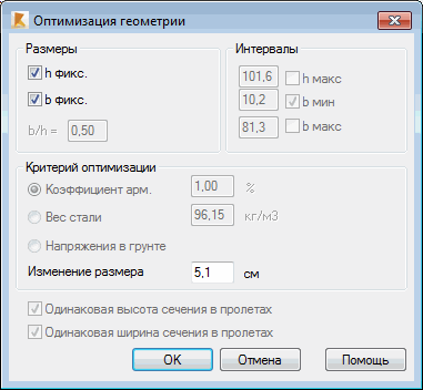 В случае многопролетной балки может быть наложено дополнительное ограничение оптимизации: требование одинаковых поперечных размеров в отдельных пролетах. Можно ограничить изменения одного или обоих размеров.