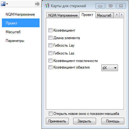 Так как в некоторых диалоговых окнах имеется очень много вкладок, они расположены по левой стороне окон. доступного сбоку диалогового окна (рисунок ниже иллюстрирует это на примере диалогового окна Карты для стержней).