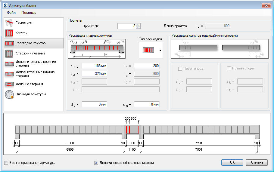 Прим.: Можно сгенерировать дополнительные хомуты над опорами в начале и в конце балки (при выборе опций Левая опора и Правая опора).
