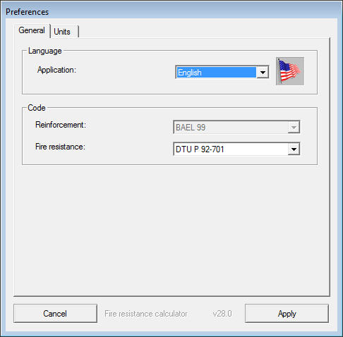 На вкладке "Общие" диалогового окна "Настройки" выберите язык отображения для калькулятора огнестойкости.