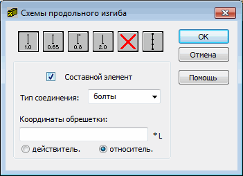 Коэффициент продольного изгиба стержня подсчитывается автоматически после выбора одной из иконок со схематическим изображением способов закрепления концов стержня. Если пользователь хочет исключить из расчета влияние продольного изгиба, то нужно щелкнуть на Это будет означать, что расчет на устойчивость не будет учитываться.