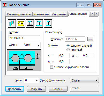 Данное диалоговое окно позволяет создавать следующие типы специальных сечений: