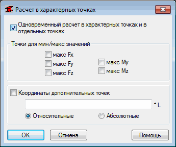 Если включена опция Одновременные расчеты в характерных точках и в равномерно расположенных точках, то расчеты элементов конструкции будут производиться как для заданных характерных точек (заданных в диалоговом окне), так и для ряда расчетных точек, заданных в диалоговом окне Конфигурация (опция Число точек).